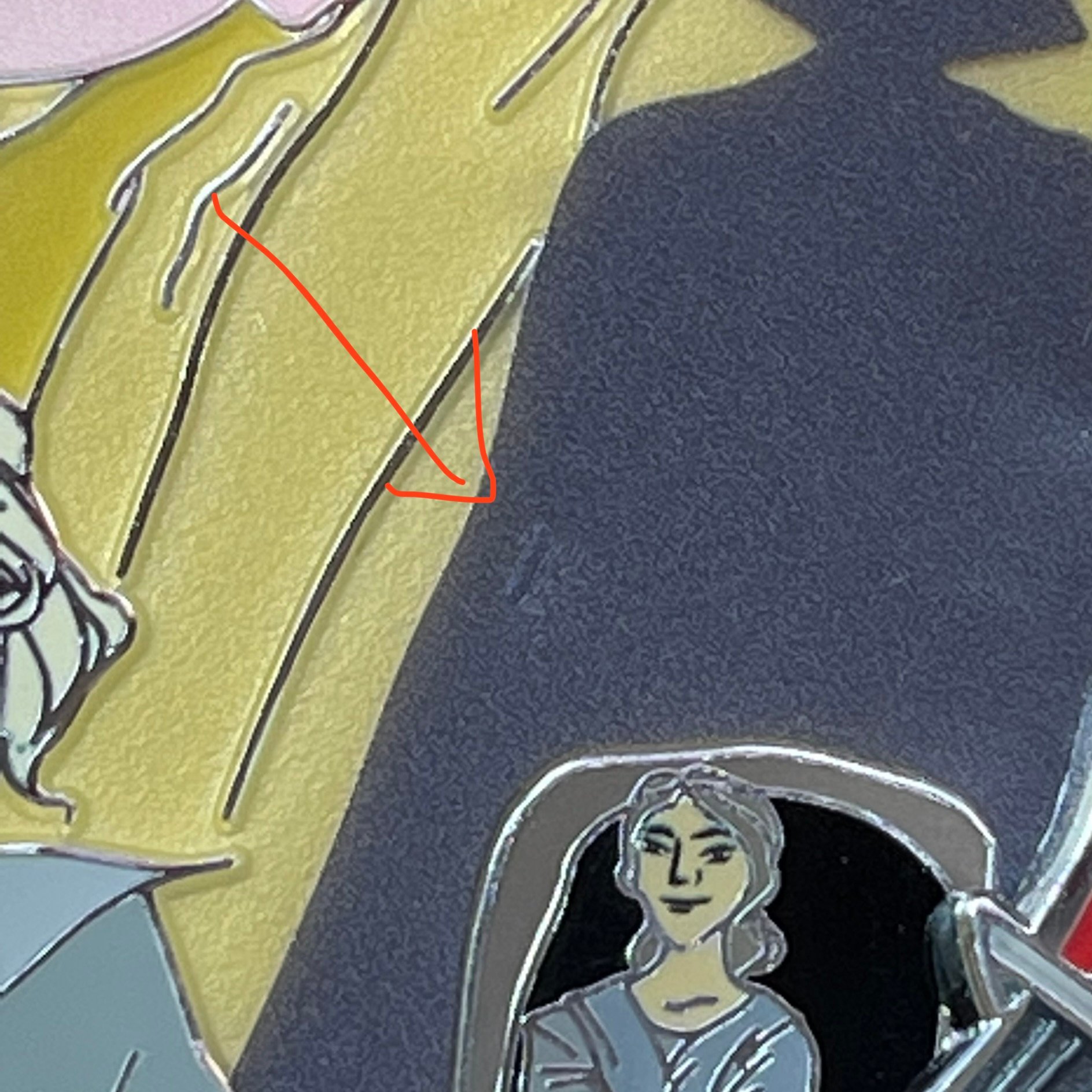 Flaws mostly consist of a small metal line/dip on the sandblasting below the Vader shadow. Some vary with how noticeable it is but overall doesn't take away from the beauty of the pin.