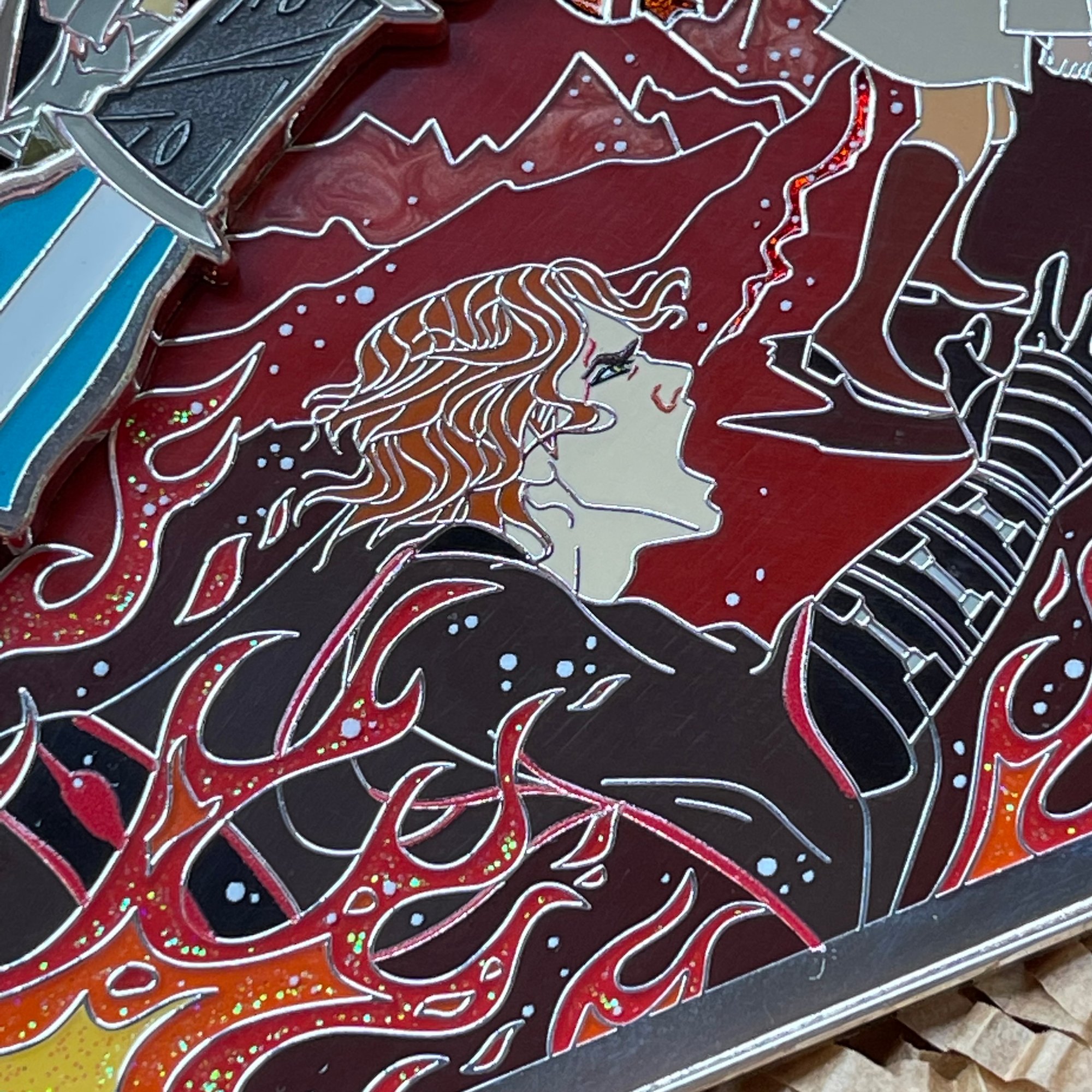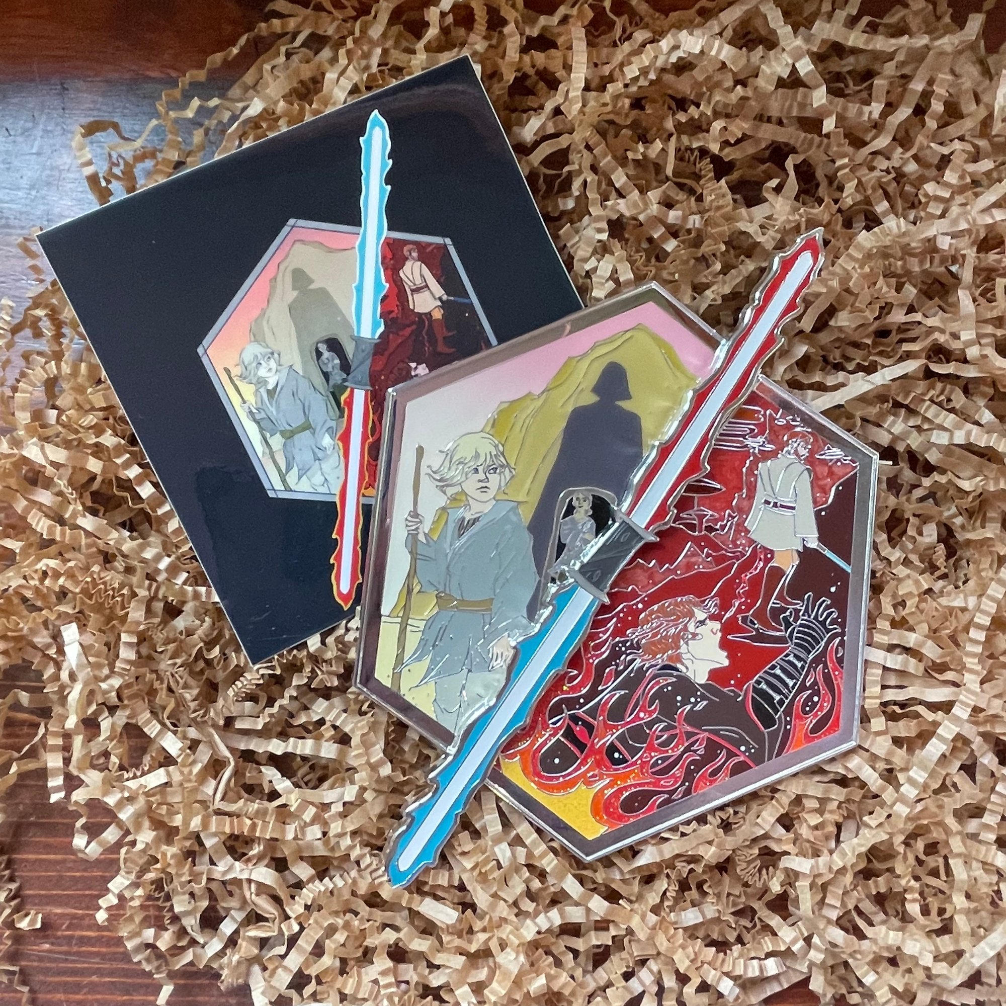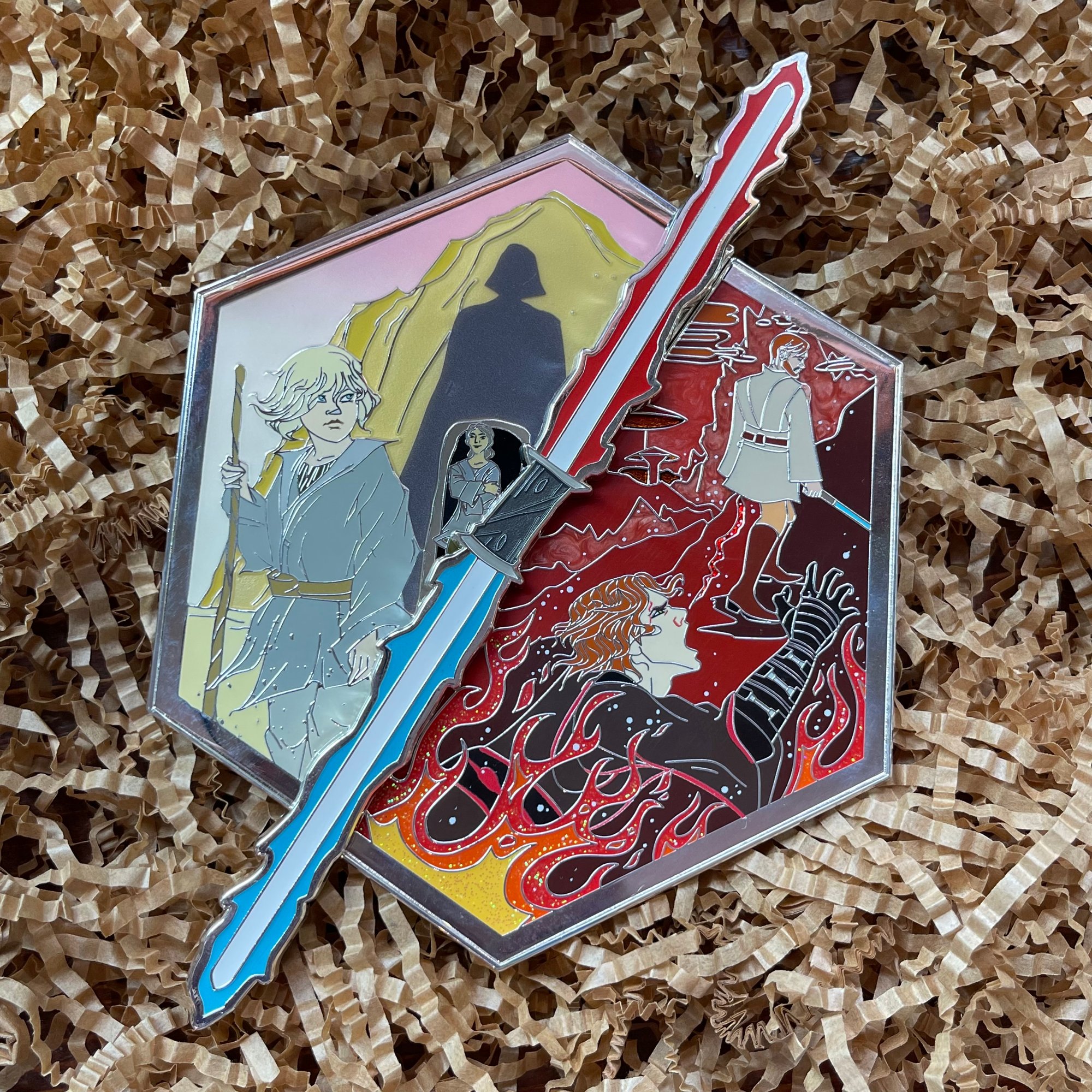 This is the first in a 3-set series and each will feature a custom backstamp. Limited edition 50 and silver plated. Pins feature glitter fire and pearlescent Mustafar as well as sandblasted and gradient Tattooine. Lightsabers also glow in the dark.