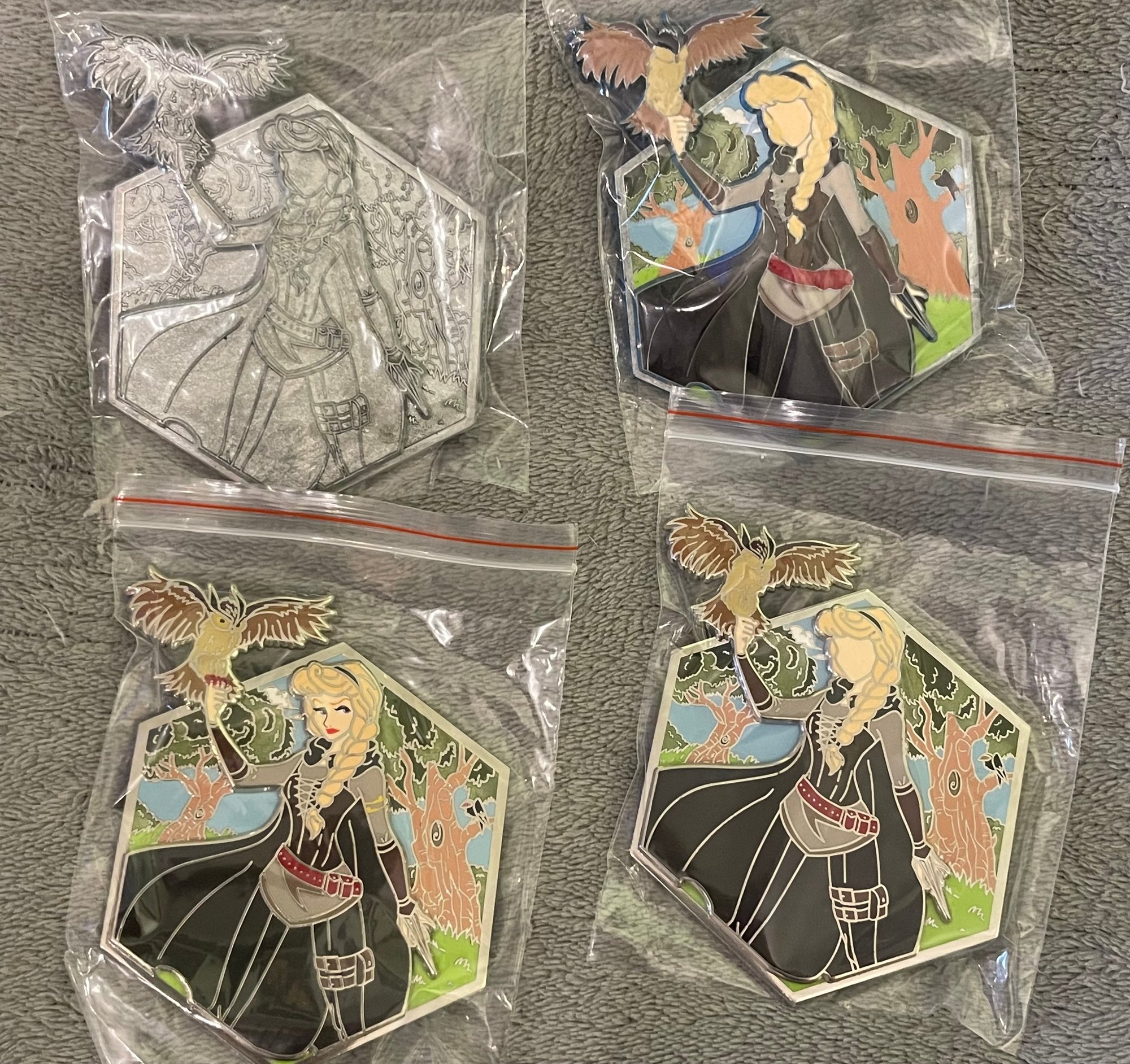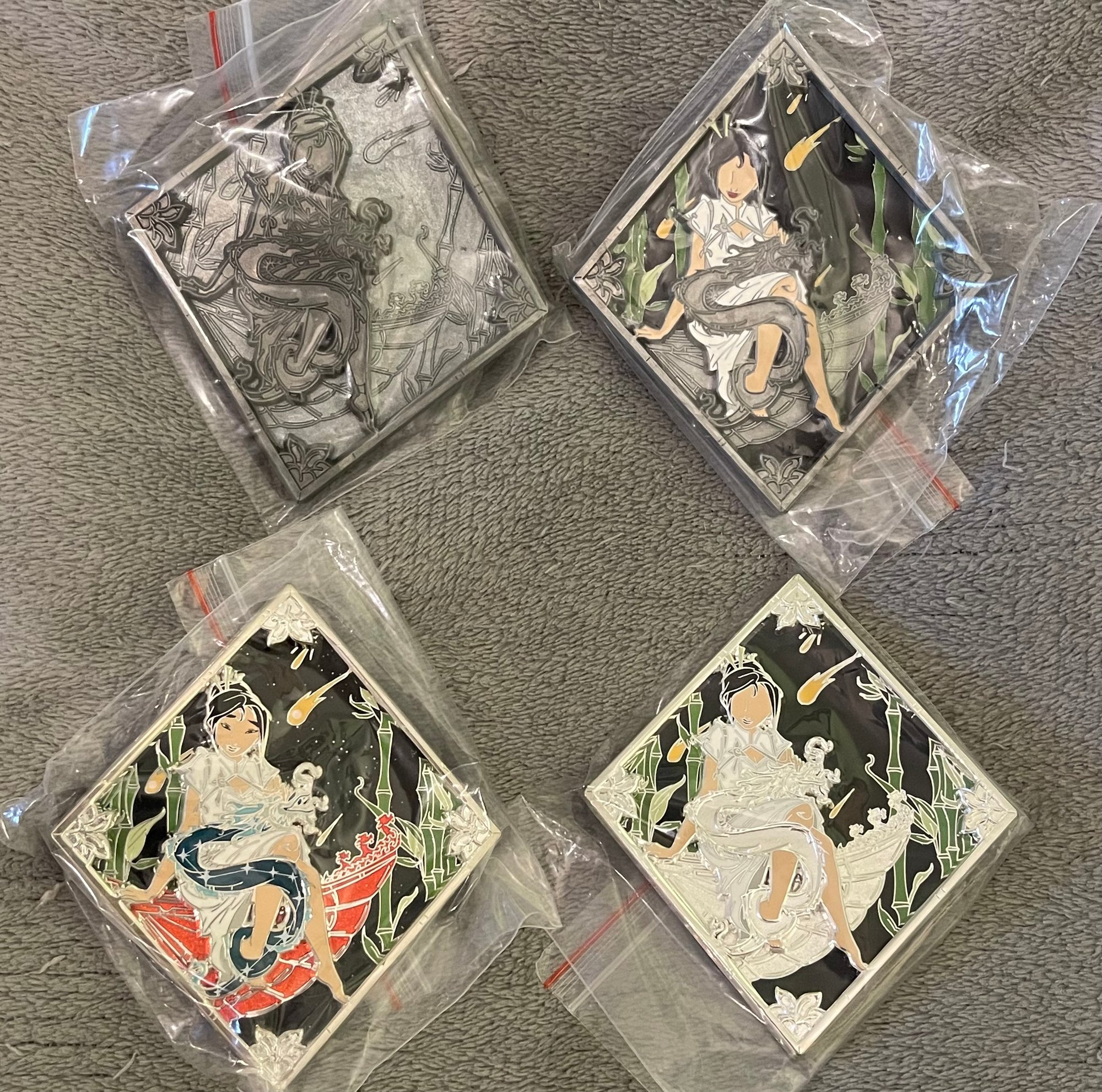 4 piece pin set showing the progression of pin production from raws to filling polishing and printing. Only one each of both sets, first pin made (Briar) and first popular (Mulan). Pins will be sent together unframed due to prior framing/shipping issues.