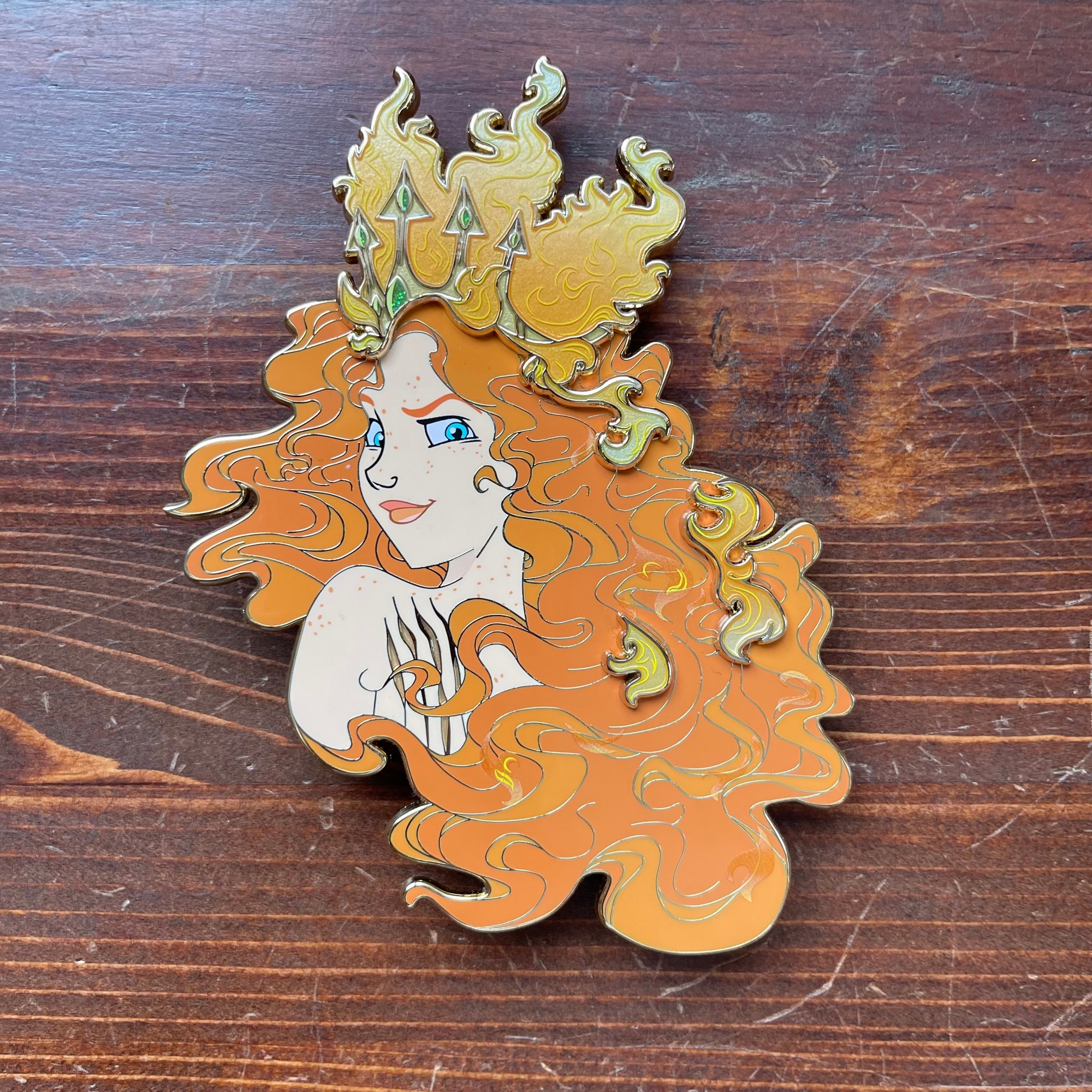 Massive 5" pin on pin of Merida in a K-Pop Crossover series Regalia - Performance Version. Here Merida is channeling serious Soojin vibes, sitting on Minnie’s intro base, wearing Yuqi’s dress and the stone lion in the background it’s the perfect G-IDLE crossover. Features stained glass flames, sandblasting and pearlescent effects. Limited Edition 50.