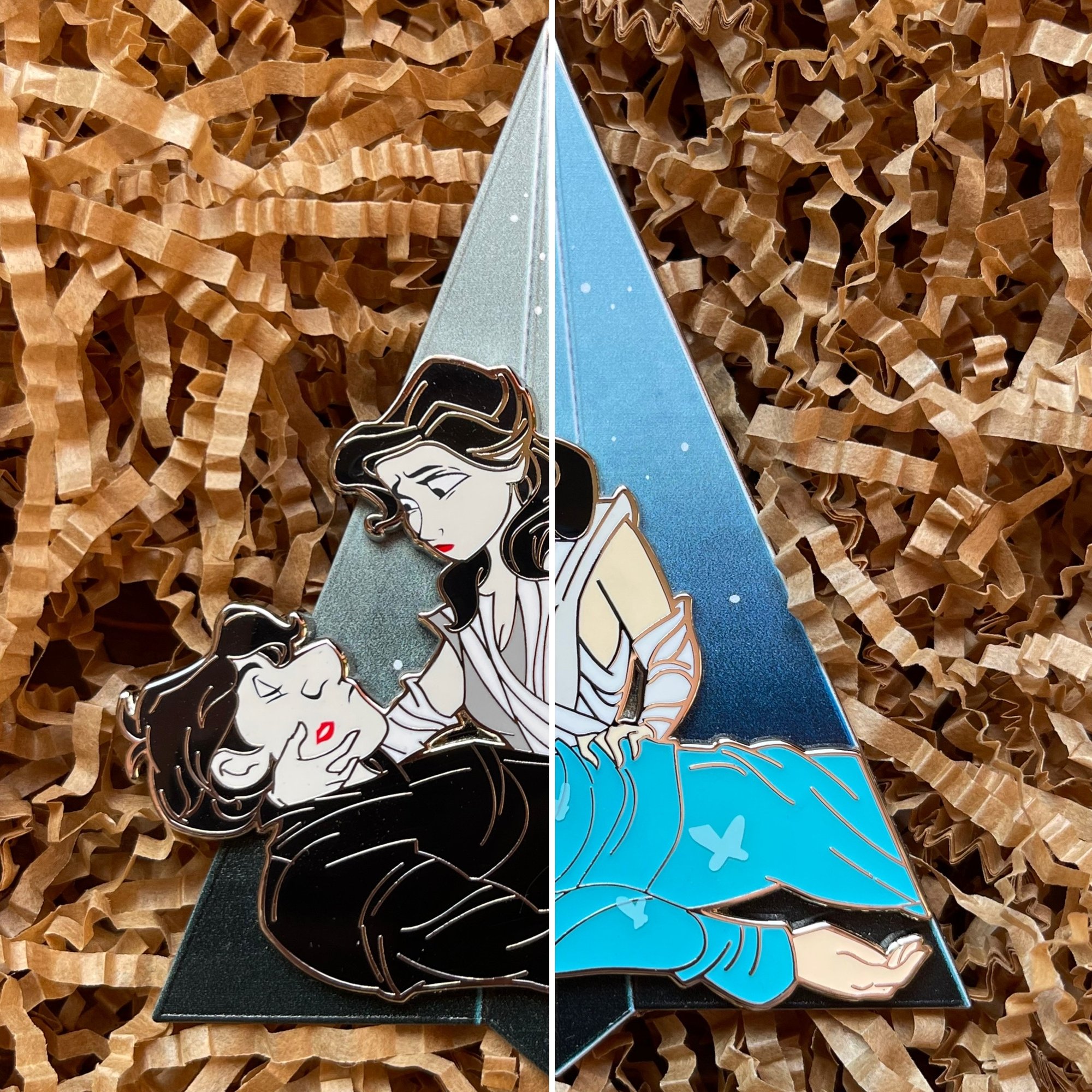 4.5” silver plated pin on pin, featuring Meg and George as the illustrious Rey and Kylo Ren. Limited Edition 60 for colour and 30 for black and white.